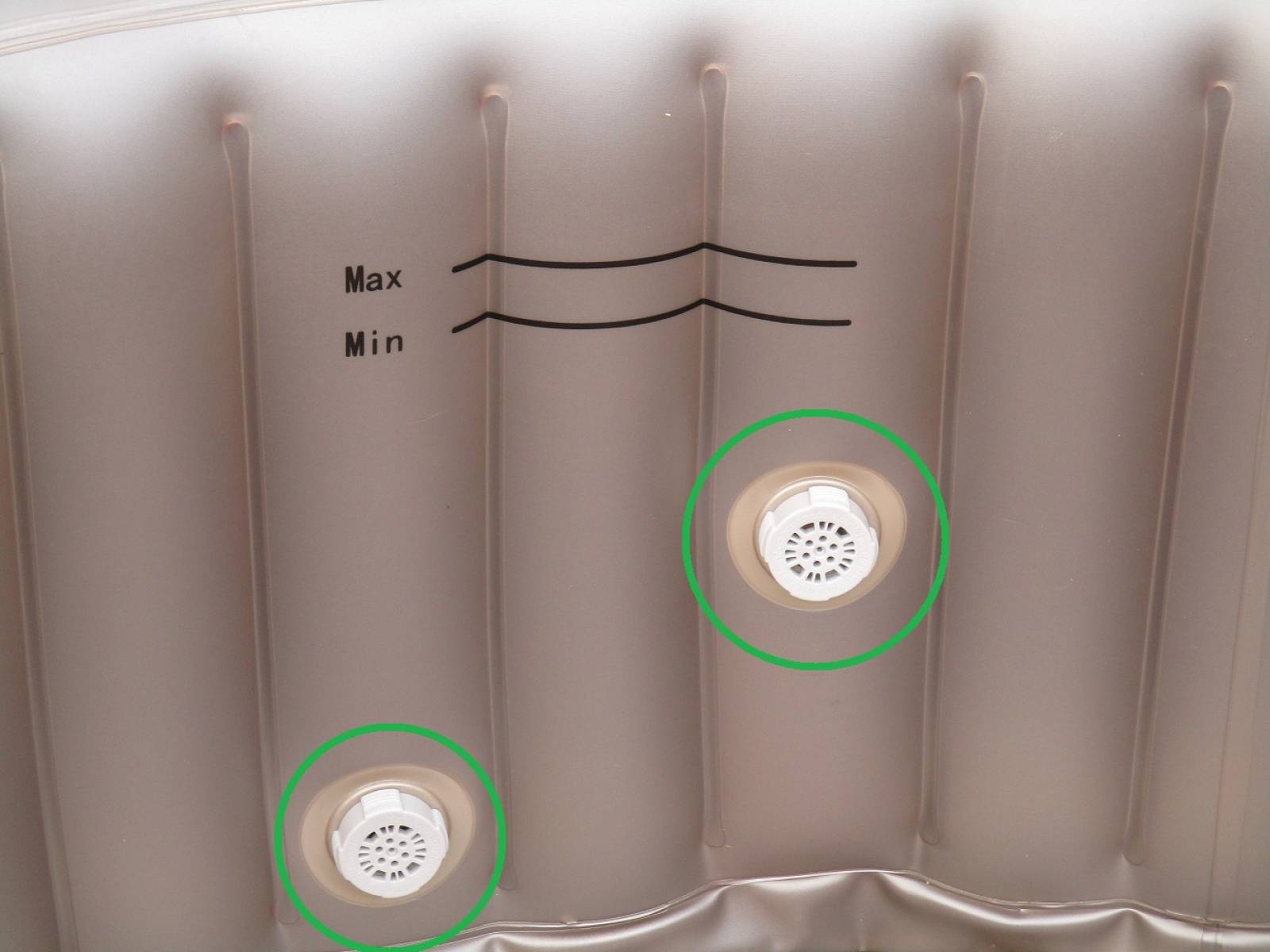 Entretien des buses : Après chaque vidange ou changement d'eau, il est important de nettoyer les deux buses situées à l'intérieur du bassin : l'une aspire l'eau et l'autre la refoule. Pour cela, dévissez délicatement les buses et retirez tout corps étranger (cheveux, feuilles, etc.) qui pourrait les obstruer. Si vous ne parvenez pas à dévisser les buses, ne forcez pas.
