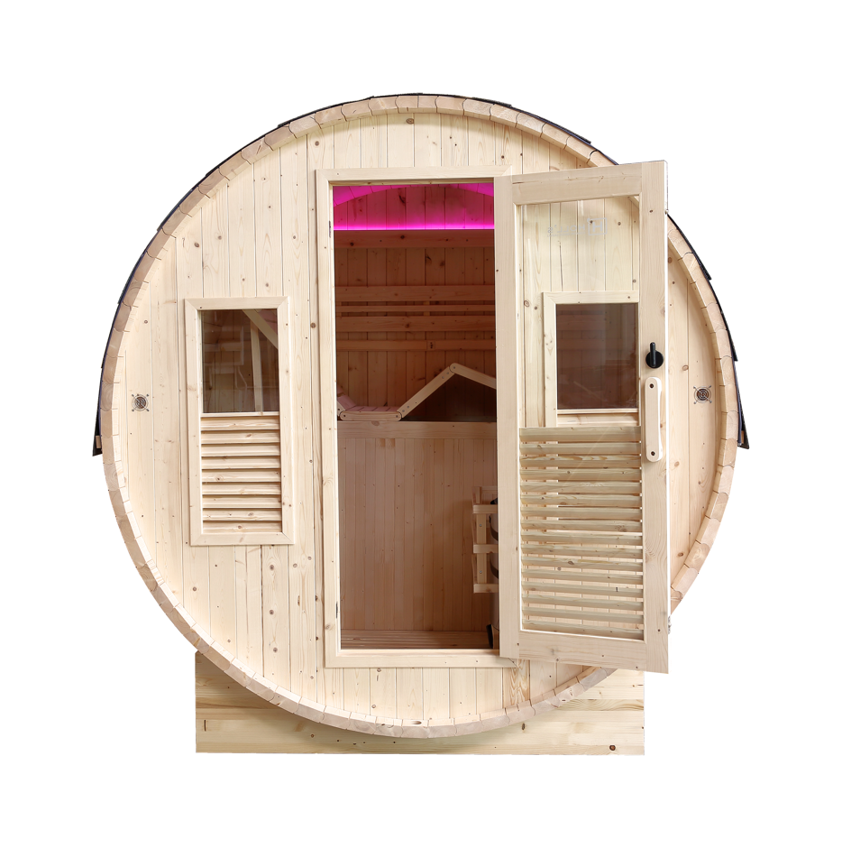 L'esthétique scandinave de cette cabine ajoutera une touche élégante à votre jardin, avec son bois clair en épicéa et ses dimensions compactes. Les vitres surmontées de persiennes confèrent du caractère à la forme circulaire de ce sauna d'extérieur.