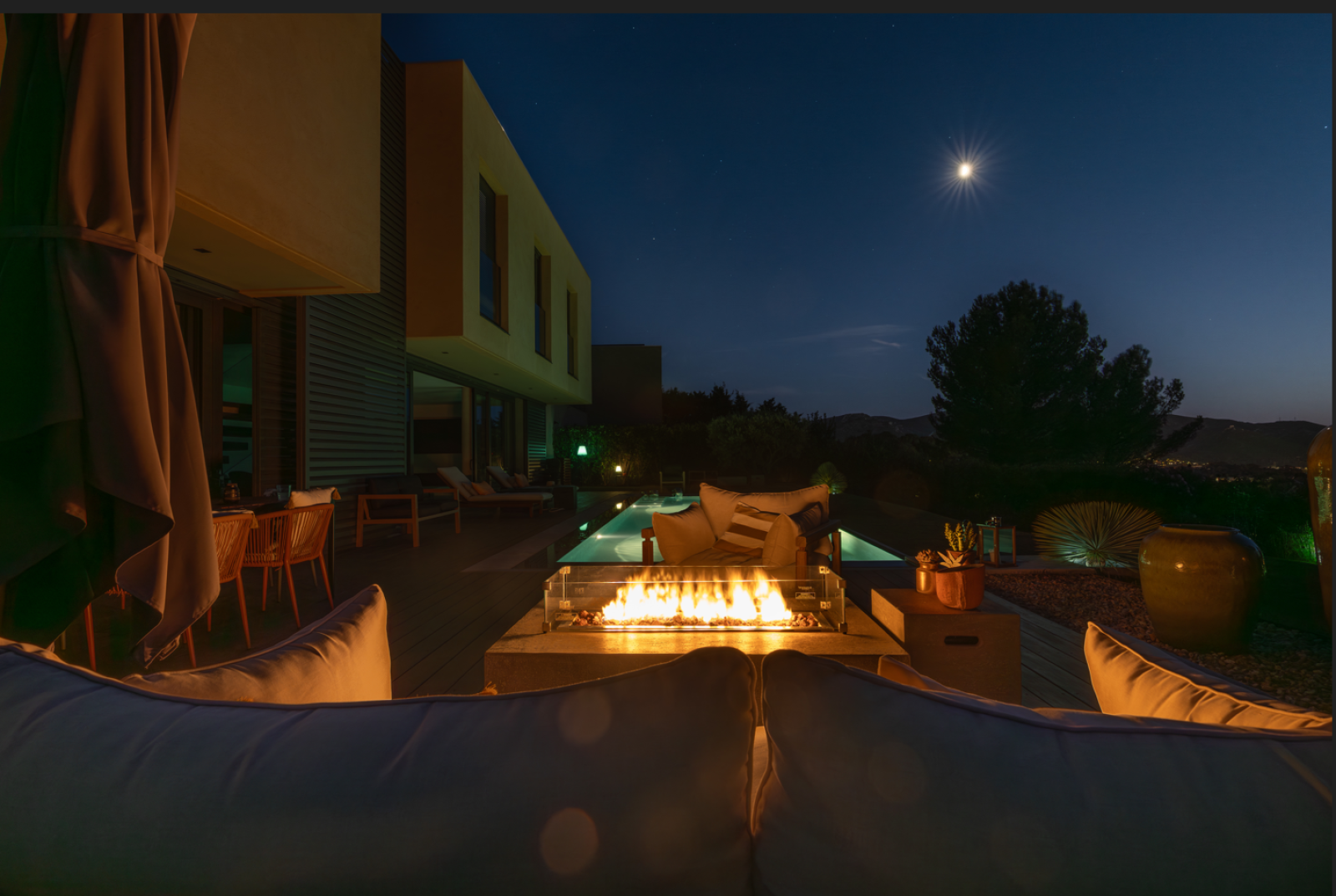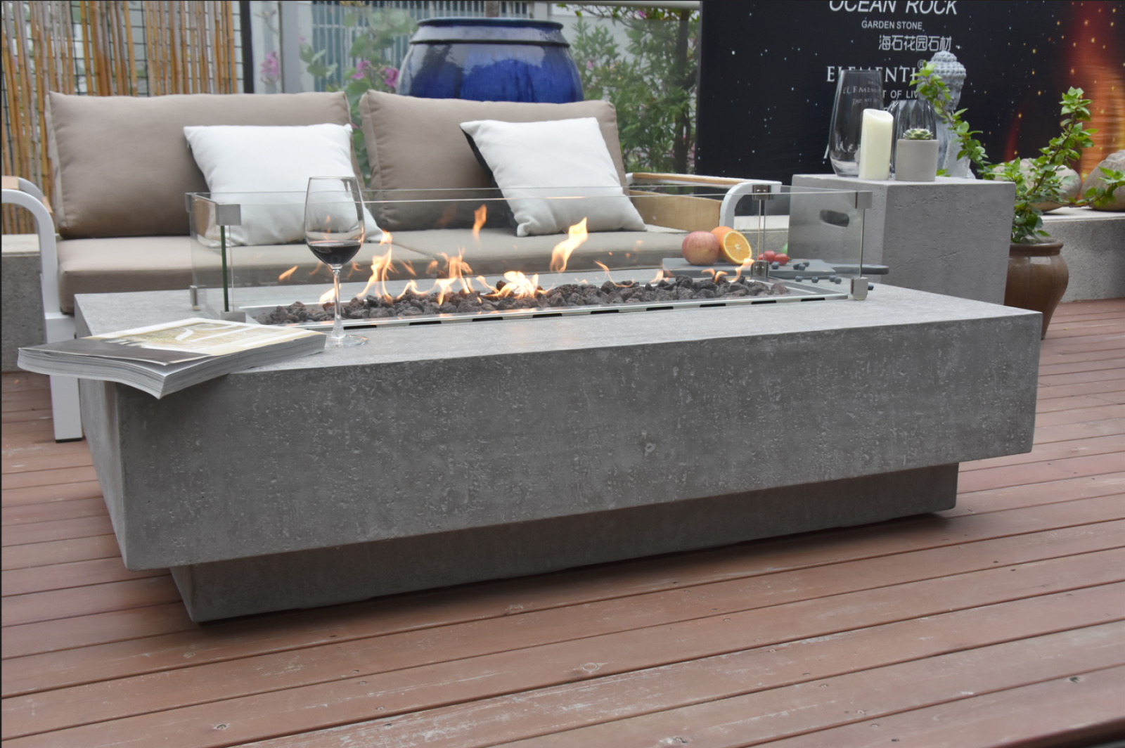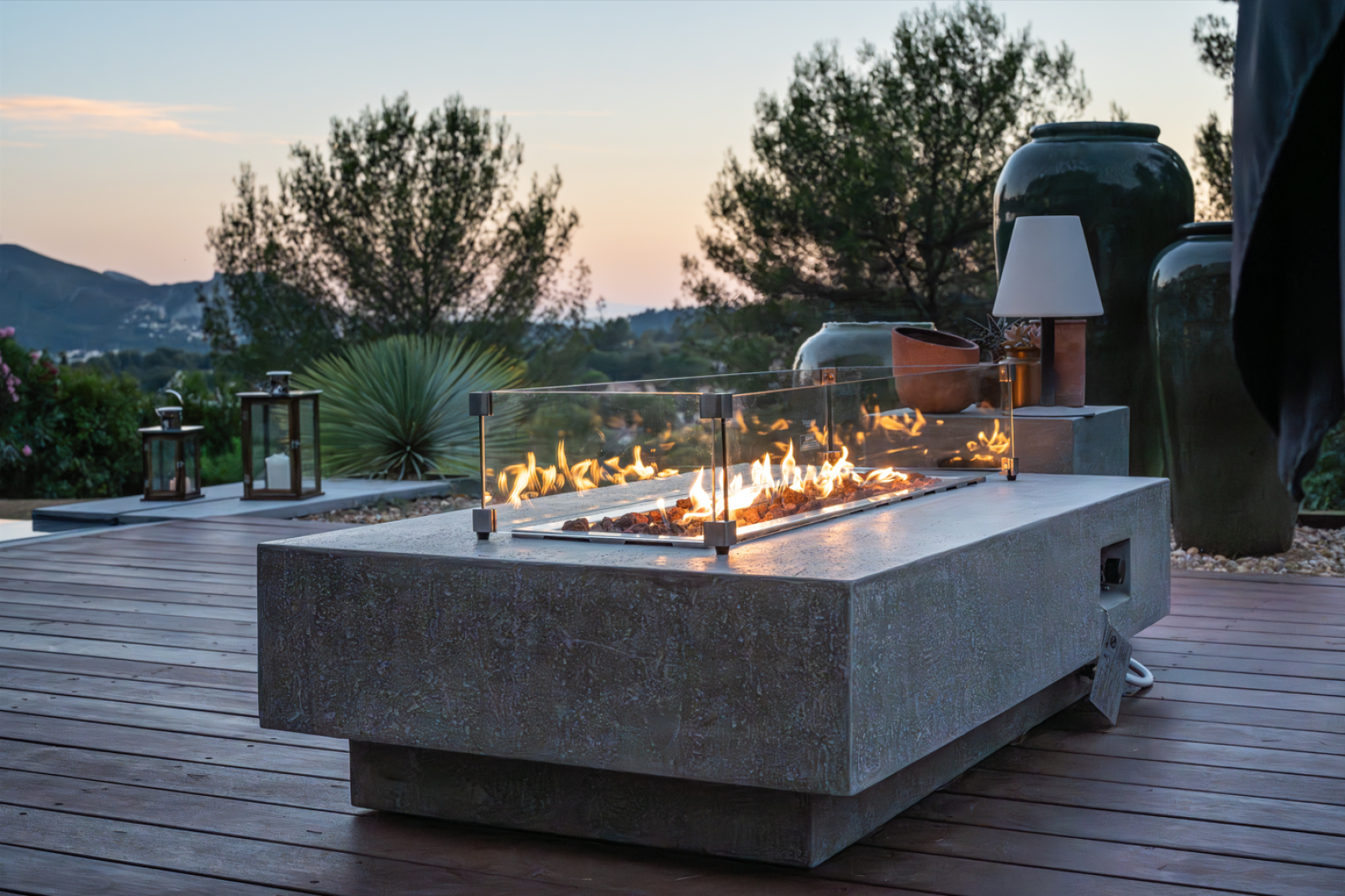 En option, vous pouvez également ajouter un coffre de bouteille, pratique pour ranger vos boissons et les garder au frais, des écrans en verre de protection du foyer pour plus de sécurité, et un couvercle de foyer qui transforme votre table brasero en une table basse classique en un instant.